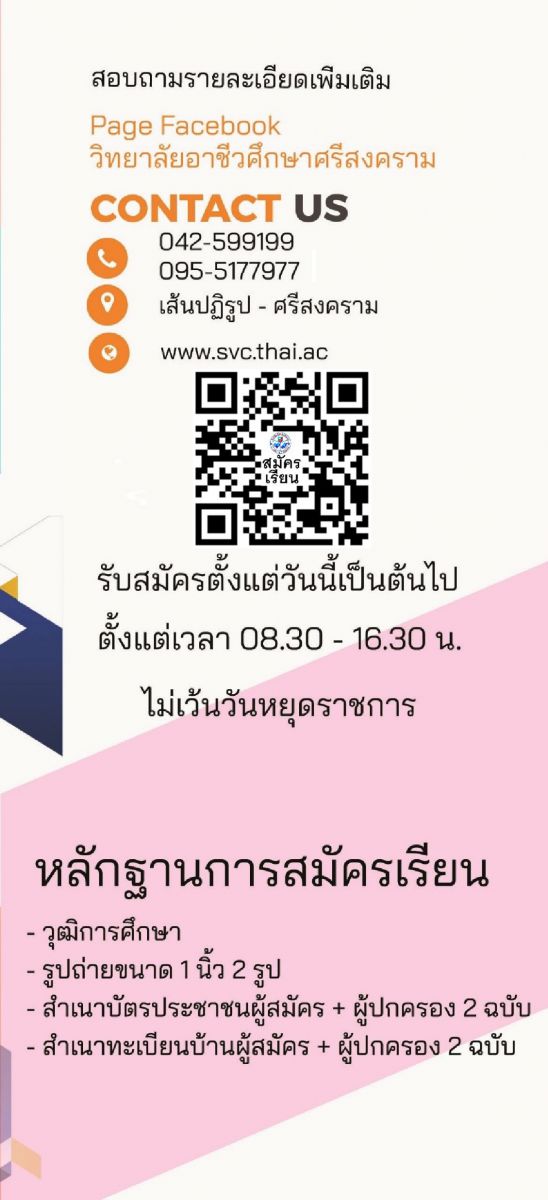 หรือ สมัครโดยตรงได้ที่วิทยาลัยอาชีวศึกษาศรีสงคราม